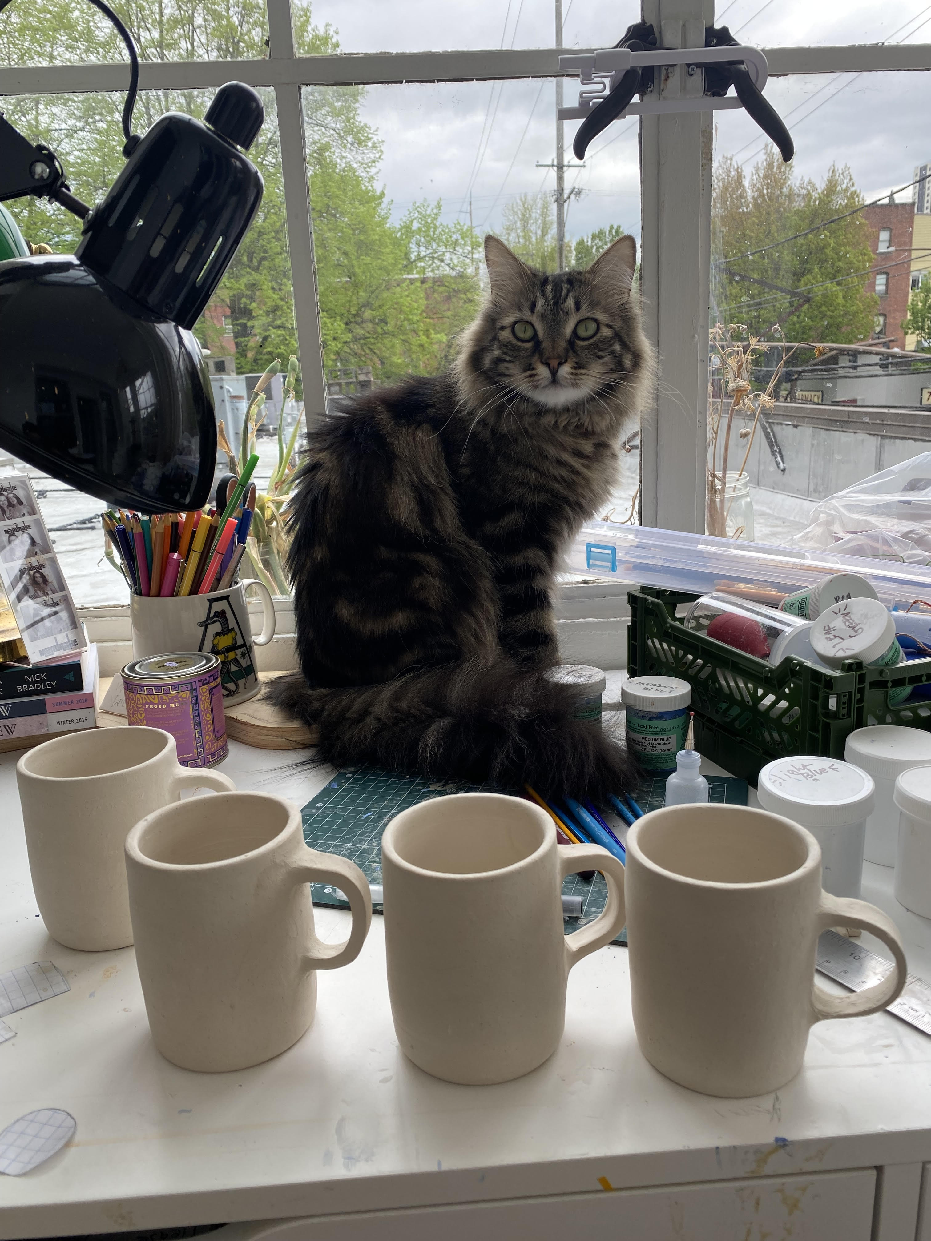 Oddy is a perfect angel. She supervises while I glaze from her window perch, and she helps model for new pots!